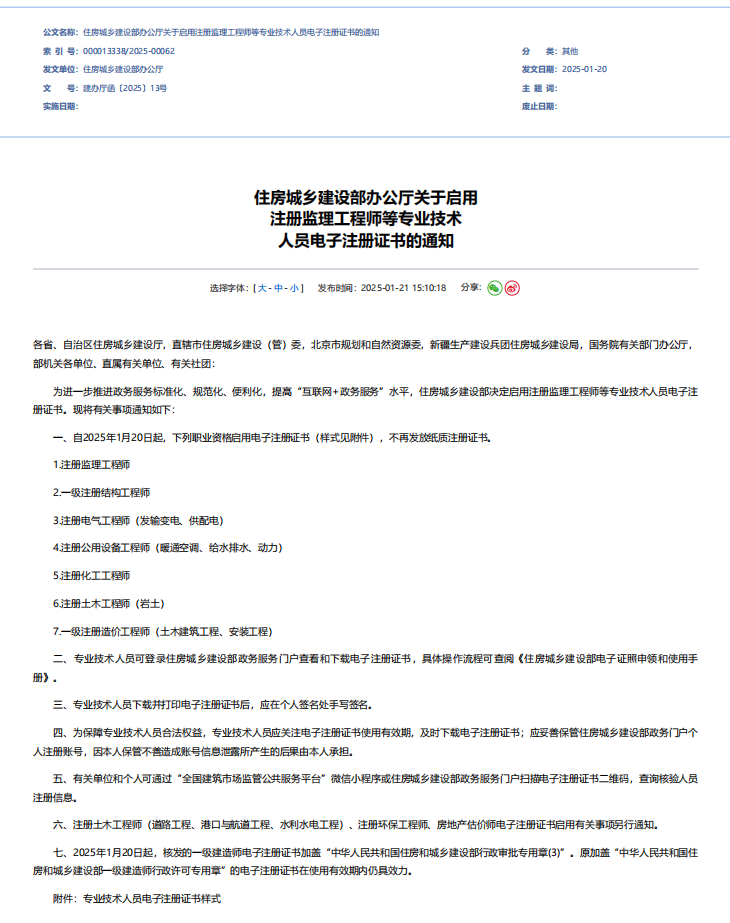 近日,住房城乡建设部办公厅印发《关于启用注册监理工程师等专业技术人员电子注册证书的通知》(建办厅函〔2025〕13号),自1月20日起注册监理工程师、一级注册结构工程师、注册电气工程师(发输变电、供配电)、注册土木工程师(岩土)、一级注册造价工程师(土木建筑工程、安装工程)启用电子注册证书,不再发放纸质注册证书,注册人员可登录住房城乡建设部政务服务门户查看和下载电子注册证书。