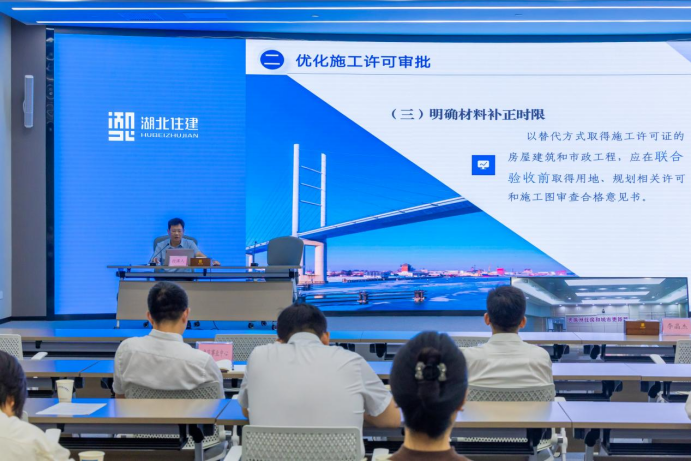 厅市场处系统解读了《中华人民共和国建筑法》《建筑工程施工许可管理办法》《湖北省建筑市场管理条例》中施工许可相关条款,讲解了优化审批服务的创新举措,并介绍了施工许可监管执法的注意事项。