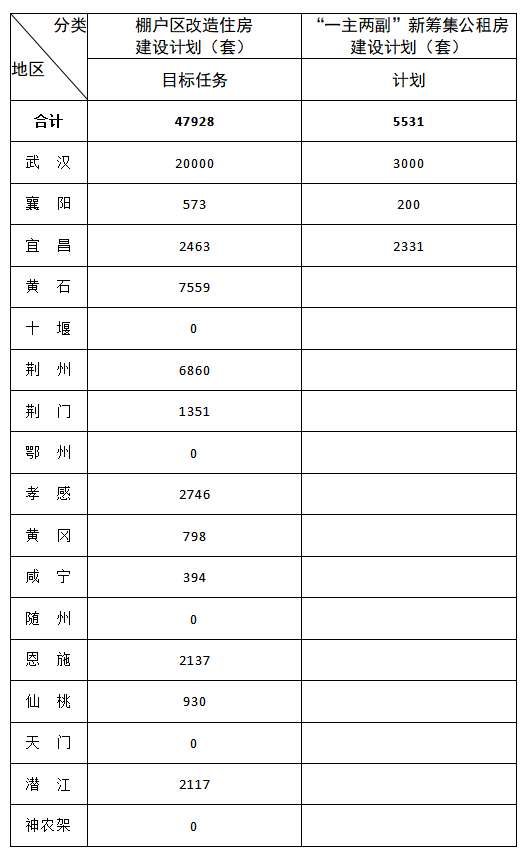 2020年湖北省保障性安居工程目标任务数