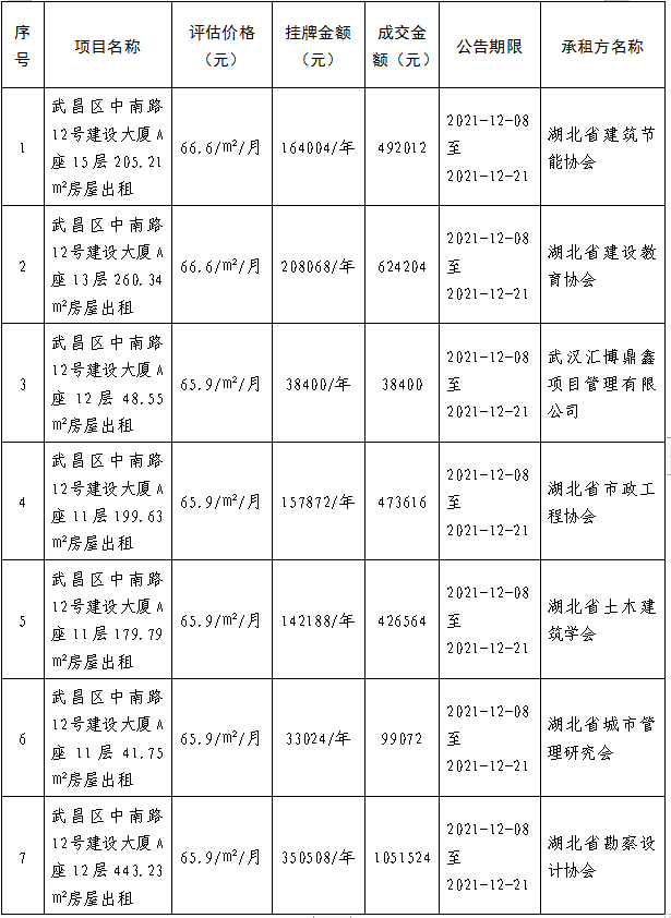 湖北华中文化产权交易所受湖北省城乡建设发展中心的委托,于2021年12月8日就其“9处房屋公开出租项目”进行公开挂牌招租。现就本次挂牌的部分房屋成交结果公告如下: