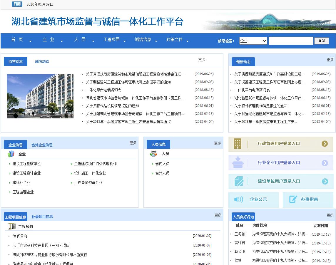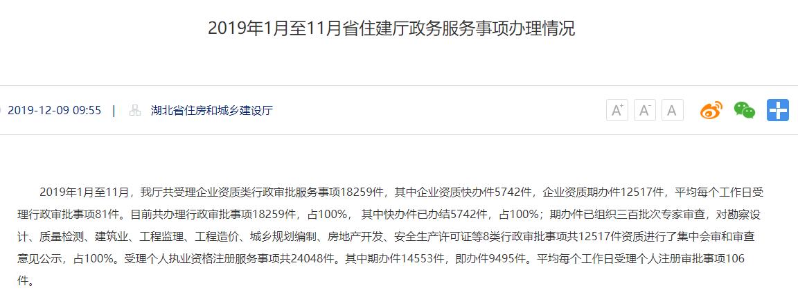 (一)《政务公开工作要点》落实情况。根据《湖北省住房城乡建设领域重大建设项目批准实施和公共资源配置皇冠博彩官网实施方案》,施工许可审批信息、招标投标信息、施工有关信息、质量安全行政处罚情况信息等通过湖北省建筑市场监督与诚信一体化工作平台公开;超限审查信息通过皇冠博彩官网网站公开;其他涉及住建领域的信息由各地行业主管部门公开。目前,湖北省建筑市场监督与诚信一体化工作平台共设有4个数据库(行业企业数据库、从业人员数据库、工程项目数据库、诚信信息数据库)和1个业务办理平台(含各类工程建设审批业务和监管业务)。目前已入库建筑施工企业14238家(其中省内企业9023家、省外企业5215家)、人员294555人(含设计、施工等各行业从业人员)、项目56505个,以上信息均可通过该平台公开查询。根据建设工程项目实施阶段的管理实际,对建设项目等环节的管理信息和办理过程全部实行网上公开,建设单位可通过该平台直接办理项目报建、招投标登记等手续,施工单位可通过该平台直接办理企业信息录入、人员信息录入手续等,大大减少企业时间,提高工作效率。2019年9月,公开了超限高层建筑工程抗震设防措施落实检查情况。