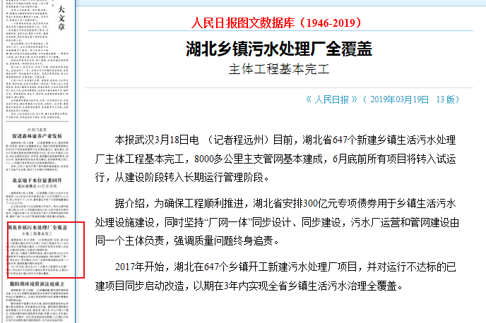 2.城镇污水处理、乡镇生活污水治理。通过皇冠博彩官网网站集中公开全省城镇污水处理设施建设运行情况、乡镇生活污水治理项目建设进展情况等。2019年,共发布城镇污水处理情况3条、乡镇生活污水治理情况1条、乡镇生活污水治理相关文件8条。2019年3月,《人民日报》以《湖北乡镇污水处理厂全覆盖主体工程基本完工》为题,央视《新闻联播》节目、湖北卫视《湖北新闻》节目以《湖北乡镇污水处理厂建设实现全覆盖》为题,报道了我省乡镇生活污水处理厂建设情况;4月,湖北卫视《湖北新闻》节目聚焦湖北长江经济带绿色发展十大战略性举措,以《让乡镇污水处理厂告别“晒太阳”》为题报道了我省乡镇生活污水处理厂建设情况。