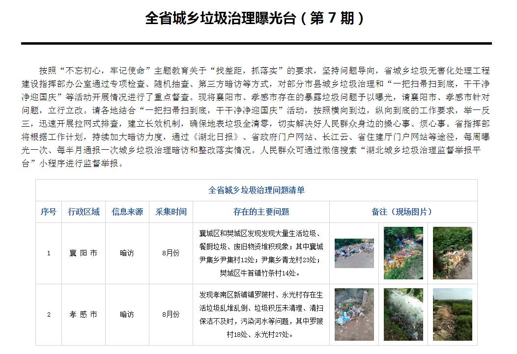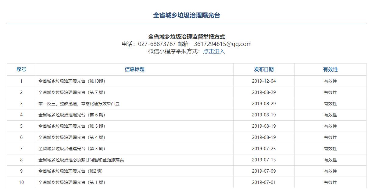 3.城乡生活垃圾无害化处理。2019年,继续做好《湖北省城乡生活垃圾无害化处理全达标工作简报》发布工作,及时公开工作进展情况。同时,建立湖北城乡垃圾治理监督举报平台,以图文结合的形式,集中发布市县城乡垃圾治理和“一把扫帚扫到底,干干净净迎国庆”等活动督查情况。通过皇冠博彩官网网站、《湖北日报》等媒体发布全省城乡垃圾治理曝光台信息8个批次。2019年7月,央视《新闻联播》节目“不忘初心、牢记使命”主题教育进行时部分报道了我厅开展垃圾治理工作情况。