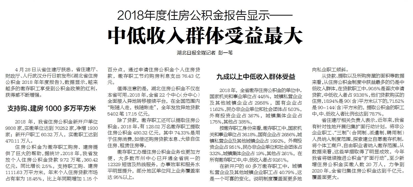 3.住房公积金监管。通过皇冠博彩官网网站、省财政厅网站和中国人民银行武汉分行网站披露全省住房公积金年度报告,进一步提升住房公积金管理透明度。督促各地严格按照住房和城乡建设部、财政部、人民银行《关于健全住房公积金信息披露制度的通知》要求,向社会披露各地住房公积金年度报告。2019年4月,发布了《湖北省住房公积金2018年年度报告》,并通过《湖北日报》等媒体推出解读报道《2018年度住房公积金报告显示——中低收入群体受益最大》。