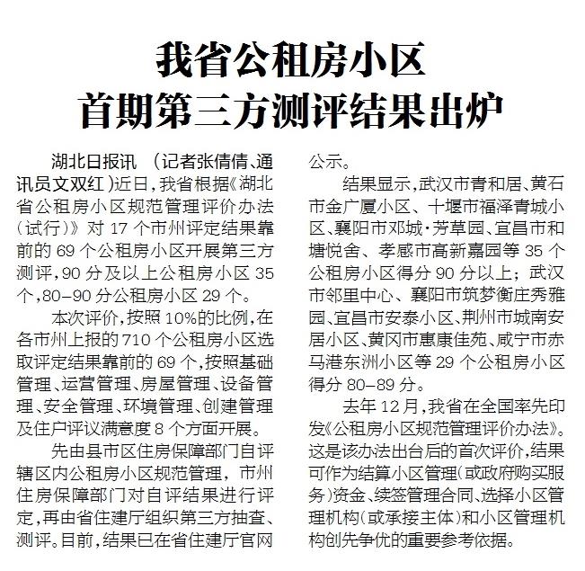 1.住房保障。进一步强化市、县住建部门信息公开主体责任,指导各地主动公开棚户区改造和保障性住房的相关政策信息,督促及时公开保障性住房房源和准入、退出等信息。2019年9月,联合湖北经视制作播出《广厦千万间——湖北住房保障成就纪实》专题片(共2集),联合《湖北日报》推出报道《从“忧居”到“优居”——住有所居的幸福密码》《湖北住房保障能力不断增强》,多角度介绍我省保障性安居工程工作取得的成就;11月,通过《湖北日报》公开了全省公租房小区首期第三方测评结果。