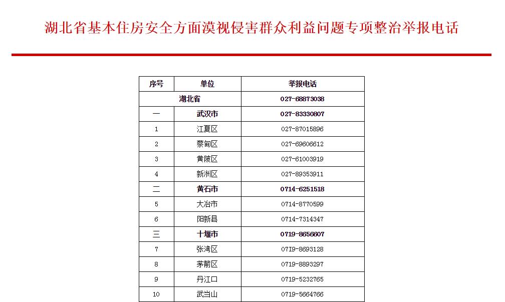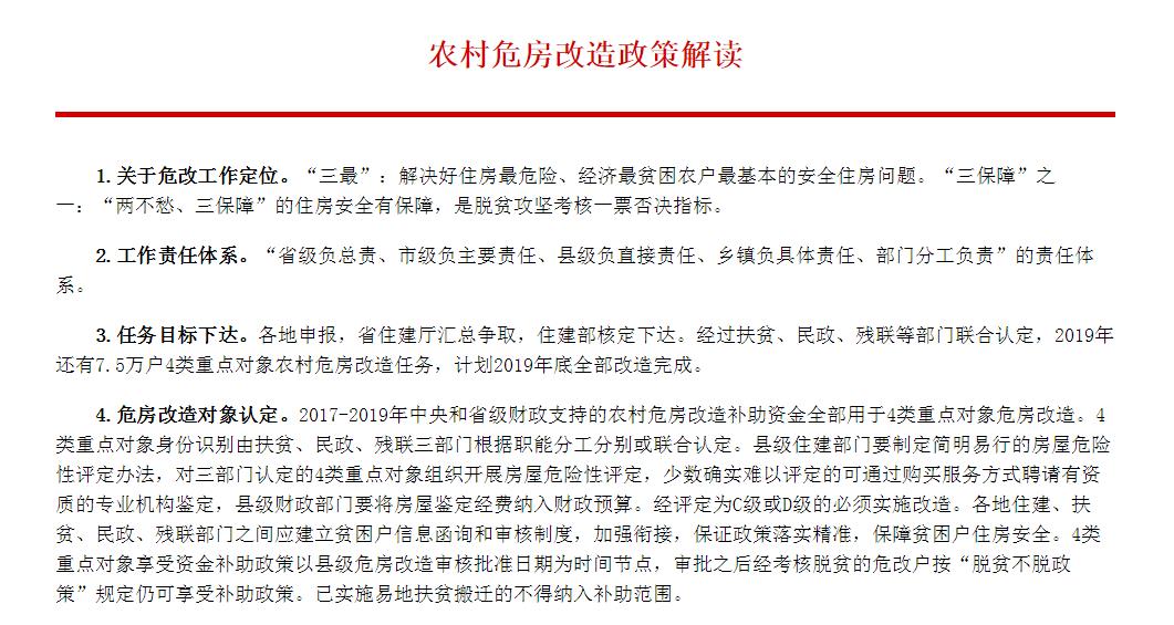 2.农村危房改造。严格按照“户申请、组评议、村评议公示、乡镇审核公示、县批准”的程序,阳光操作,透明化管理。指导各地认真落实危房改造项目资金公告公示工作,制作《农村危房改造政策明白卡》免费发放到每个危改户,让广大农民群众充分了解和掌握农村危房改造补助对象、补助标准、申请程序、建设方式、工作要求等基本政策。县级住建部门设立农村危房改造举报电话,在各村村务公开栏显著位置公示。通过皇冠博彩官网网站公开农村危房改造政策文件、工作进展情况等。2019年8月,发布了《农村危房改造政策解读》,重点就农村危房改造工作定位、工作责任体系、任务目标下达、危房改造对象认定、审批程序、改造方式、补助标准、面积标准、质量管控、检查验收、资金拨付、档案建立、信息录入、政策宣传、业务培训等15个方面做了介绍;10月,开展湖北省基本住房安全方面漠视侵害群众利益问题专项整治,公布了省级及各市(县)举报电话共107个。