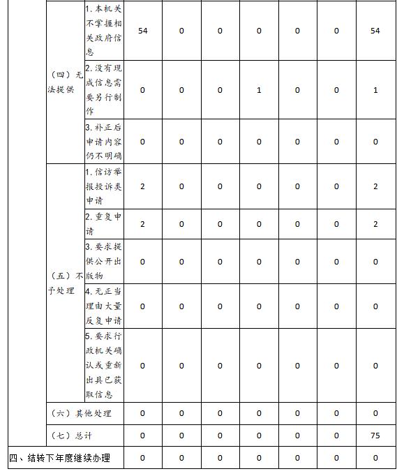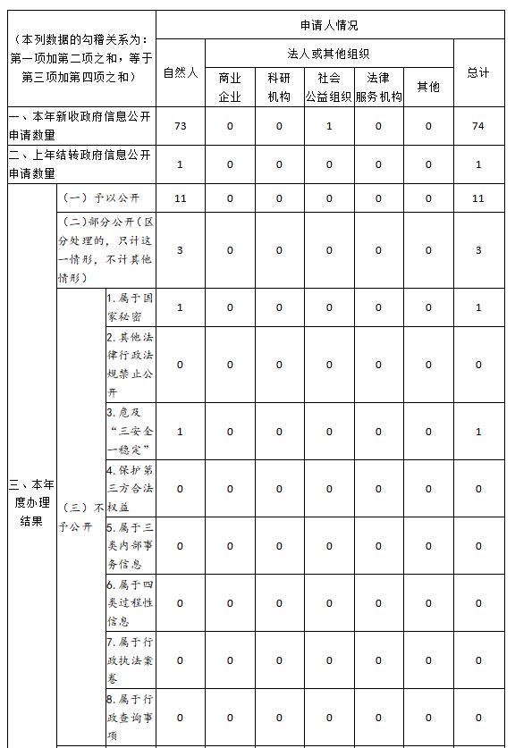 2019年,我厅共处理皇冠博彩官网申请75件,其中新收到皇冠博彩官网申请74件、上年结转皇冠博彩官网申请1件,予以公开11件、部分公开3件,不予公开2件,无法提供55件,不予处理的5件。