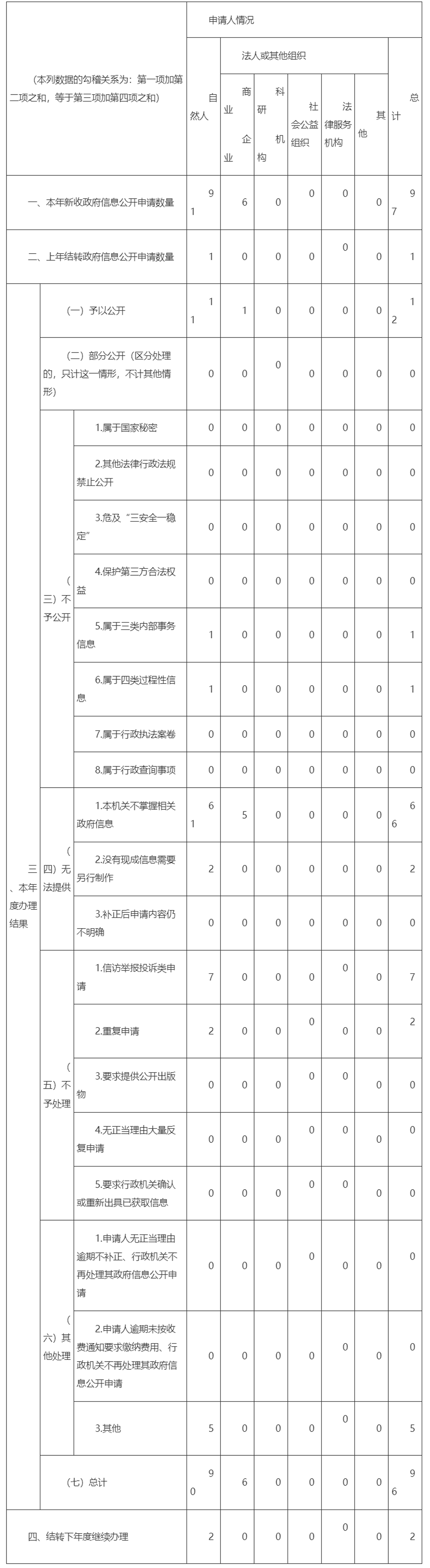 严格按照省政府统一启用的依申请公开系统和政务邮箱接收皇冠博彩官网申请。本年度共收到皇冠博彩官网申请97件,结转下年度办理1件,其余全部在法定时限内作出了答复且未收取任何费用,有效保障了公众依法行使知情权、参与权、表达权、监督权。